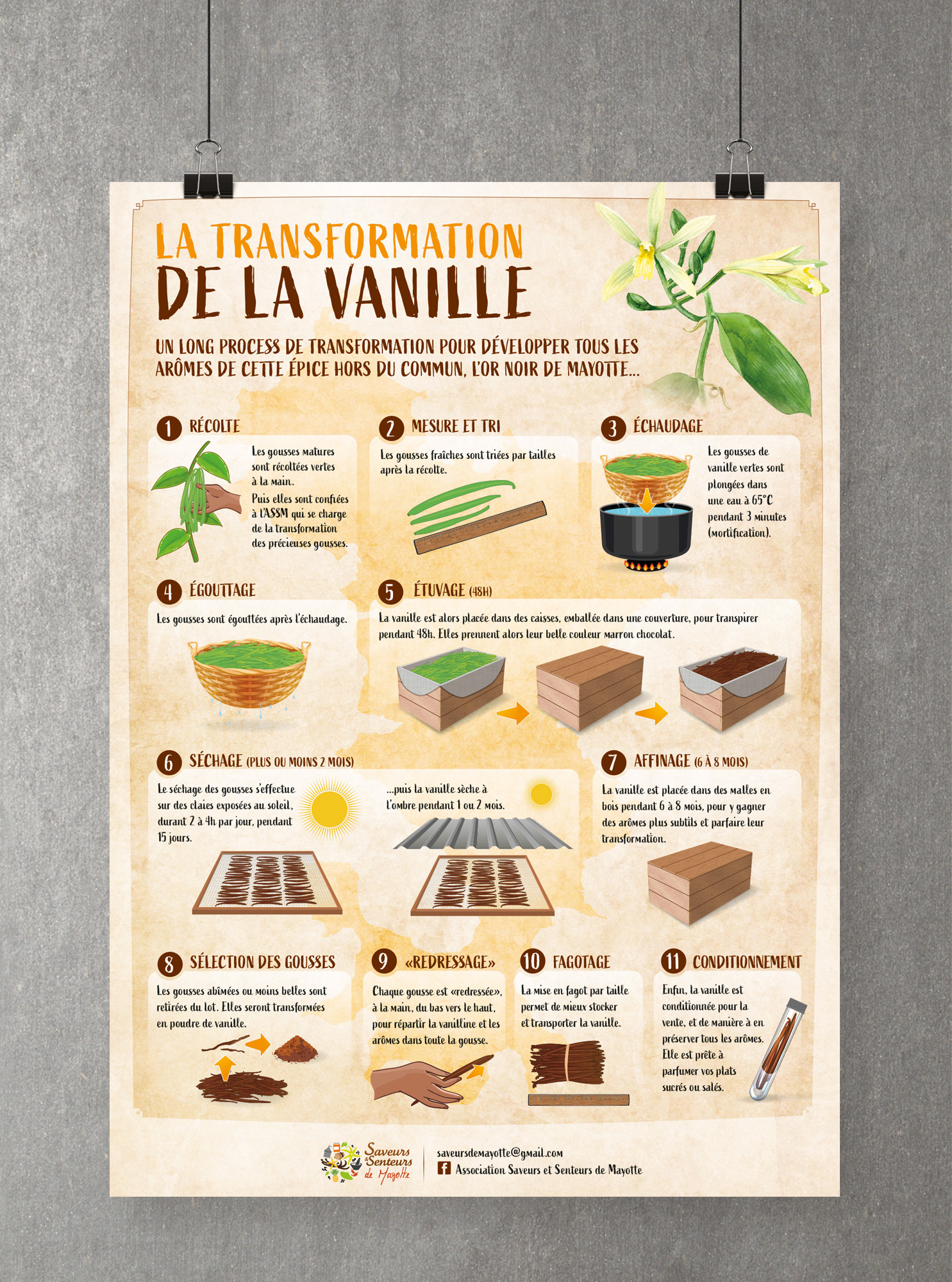 Un exemple de travail d'illustration pour la réalisation d'un panneau explicatif sur les étapes de transformation de la vanille.